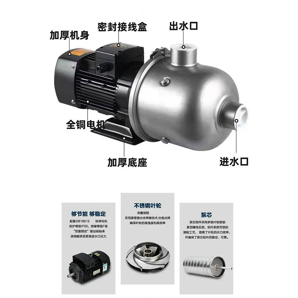 • CHL2-30‌:电机功率0.55kW,流量28m³/h,扬程32m。